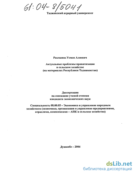 приватизации сельского хозяйства в особенных условиях развития Республики Таджикистан, не обоснованы формы государственной постприватизационной поддержки в условиях ограниченности финансовых возможностей государства. В представленной диссертационной работе, предпринята попытка ответить на перечисленные выше вопросы. Такие ответы необходимы для совершенствования работы по повышению эффективности процессов приватизации в сельском хозяйстве Таджикистана и повышения эффективности экономических реформ в масштабе отрасли.