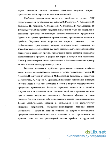 Реальные процессы и проблемы приватизации сельского хозяйства стали предметом пристального анализа в трудах таджикских ученых И. Асророва, И. Ашурова, С. Балховой, М. Баротова, X. Гафурова, М. Давлятова, С. Ис мои лова, X. Умарова, А. Эргашева. В их работах показана вся ситуация, имевшая место в сельском хозяйстве в связи с широко развернувшимися процессами приватизации. Вскрыты серьезные недостатки и ошибки, допущенные в ходе приватизации сельского хозяйства и причины, которые препятствовали получению ожидаемого обществом эффекта от этого процесса. Вместе с тем, в их работах не рассматриваются те организационные формы хозяйствования, которые в наибольшей мере соответствуют нынешним потребностям социально-экономического развития страны. Экономисты - аграрники еще не ответили на вопрос о соотношении процессов восстановления сельского хозяйства и его приватизации во времени. Ими не дан развернутый анализ проблем и трудностей