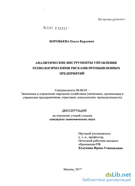 Диссертационная работа выполнена в соответствии с паспортом специальности 08.00.05 - «Экономика и управление народным хозяйством» (экономика, организация и управление предприятиями, отраслями, комплексами: промышленность), п. 15.11. «Оценка и страхование рисков хозяйствующих субъектов», п. 15.13. «Инструменты и методы менеджмента промышленных предприятий, отраслей, комплексов».