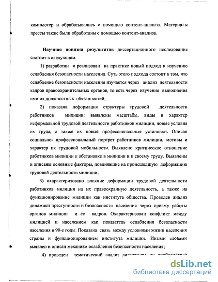 3) охарактеризовано влияние деформации трудовой деятельности работников милиции на их правоохранную деятельность, а также на функционирование милиции как института общества. Проведен анализ динамики преступности и безопасности населения через призму работы органов милиции и ее кадров. Охарактеризован конфликт между милицией и населением как показатель ослабления безопасности населения в 90-е годы. Показана связь между условиями жизни населения страны и функционированием института милиции. Иными словами выявлен и описан механизм ослабления безопасности населения;