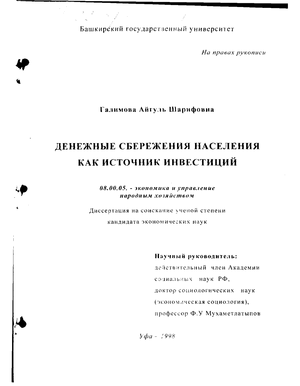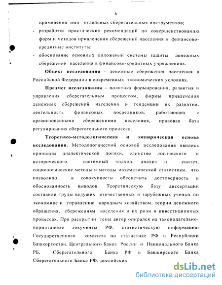Цель исследования: на основе определения роли и места денежных сбережений населения на рынке инвестиционных ресурсов раскрыть особенности мотивов и факторов управления сберегательным процессом и новых тенденций его развития в современных условиях. Задачи исследования: - выявление особенностей сберегательного процесса, мотивов и системы социально-экономических факторов, обусловливающих его развитие; - определение основных принципов функционирования сбережений населения в рамках формирования рынка инвестиционных ресурсов; - исследование практической деятельности финансовых посредников на рынке сбережений населения и особенностей применения ими отдельных сберегательных инструментов; - разработка практических рекомендаций по совершенствованию форм и методов привлечения сбережений населения в финансово-кредитные институты; - обоснование основных положений системы защиты денежных сбережений населения в финансово-кредитных учреждениях. Объект исследования - денежные сбережения населения в Российской Федерации в современных экономических условиях. Предмет исследования - политика формирования, развития и управления сберегательным процессом, формы привлечения денежных сбережений населения и тенденции их развития, деятельность финансовых посредников, работающих с организованными сбережениями населения, правовая база регулирования сберегательного процесса. Теоретико-методологическая и эмпирическая основа исследования. Методологической основой исследования явились принципы диалектической логики, единство логического и исторического, системный подход, анализ и синтез, социологические методы и методы математической статистики, что позволило в совокупности обеспечить достоверность и обоснованность выводов. Теоретическую базу диссертации составили труды ведущих отечественных и зарубежных ученых по экономике и управлению народным хозяйством, теории денежного обращения, сбережениям населения и их роли в инвестиционных процессах. При раскрытии темы автор опирался на законодательно нормативные документы РФ, статистическую информацию Государственного комитета по статистике РФ и Республики Башкортостан, Центрального Банка России и Национального Банка РБ, Сберегательного Банка РФ и Башкирского Банка Сберегательного Банка РФ, российских и зарубежных коммерческих банков. Научная новизна работы: - определены исходные экономические условия функционирования сбережений населения в современных инвестиционных процессах, выделены изменения в системе факторов, условий и мотивов, приводящих к образованию сбережений в связи с развитием рыночных отношений в России; раскрыто новое содержание понятия денежных сбережений населения как источника капитала, основы формирования рынка инвестиций и важнейшего элемента механизма финансирования воспроизводства на всех уровнях в современных экономических условиях; - на основе системно-структурного анализа выделены латентные сбережения; с учетом фактора теневой экономики уточнена классификация денежных сбережений населения, направленная на обоснованность приоритетов управления сберегательным процессом; - предложена принципиально новая схема формирования и развития денежных сбережений населения, заключающаяся в полном охвате потенциальных денежных с