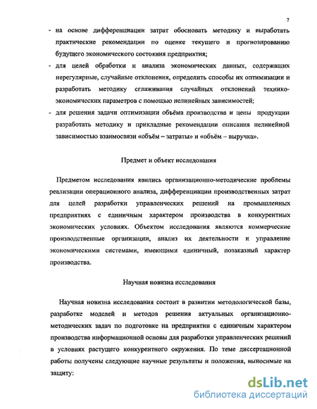 Цель и задачи исследования. Цель диссертационной работы состоит в научном обосновании, разработке методик и практических рекомендаций по подготовке на предприятии с индивидуальным, (единичным) характером производства, информационной основы для разработки краткосрочных и перспективных управленческих решений, направленных на улучшение экономических показателей и повышение конкурентоспособности. В качестве средств, для этих целей используются классификация, структуризация, анализ производственных затрат, их дифференциация на переменную и постоянную части и аналитические оценки, получаемые в рамках операционного анализа. Для достижения поставленной цели были сформулированы следующие задачи: