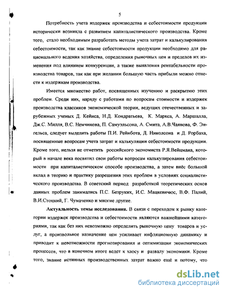Имеется множество работ, посвященных изучению и раскрытию этих проблем. Среди них, наряду с работами по вопросам стоимости и издержек производства классиков экономической теории, ведущих отечественных и зарубежных ученых Д. Кейнса, Н.Д. Кондратьева, К. Маркса, А. Маршалла, Дж.С. Милля, B.C. Немчинова, П. Самуэльсона, А. Смита, А.В.Чаянова, Ф. Энгельса, следует выделить работы П.И. Рейнбота, Д. Николсона и Д. Рорбаха, посвященные вопросам учета затрат и калькуляции себестоимости продукции. Кроме того, нельзя не отметить российского экономиста Р.Я.Вейцмана, который в начале века посвятил свои работы вопросам калькулирования себестоимости при капиталистическом способе производства, а затем внёс большой вклад в теорию и практику разрешения этих проблем в условиях социалистического производства. В советский период разработкой теоретических основ данных проблем занимались П.С. Безруких, И.С. Мацкевичюс, В.Ф. Палий, В.И.Стоцкий, Г. Чумаченко и многие другие.