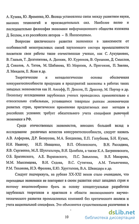 Среди отечественных экономистов, внесших большой вклад в исследование различных аспектов конкурентоспособности, следует назвать А.В. Алферова, Д.Р. Белоусова, М.А. Бендикова, Е.П. Голубкова, Б.Н. Кузык, Н.И. Иванову, Н.П. Иващенко, В.П. Оболенского, В.Н. Рассадина, Я.В. Сергиенко, М.Л. Шухгальтера, В.И. Цымбала, а также К.А. Багриновского, О.Б. Брагинского, А.Е. Варшавского, П.С. Завьялова, В.Л. Макарова, М.М. Максимцова, В.И. Седова, B.C. Сутягина, A.M. Татьянченко, P.M. Тихонова, И.Э. Фролова, Е.Ю. Хрусталева, В.А. Швандара и др.