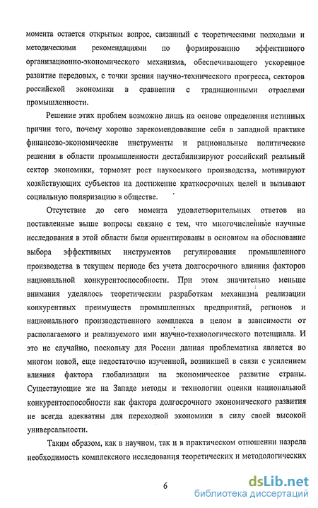 Таким образом, как в научном, так и в практическом отношении назрела необходимость комплексного исследования теоретических и методологических проблем, связанных с оценкой влияния процессов глобализации на структурно несбалансированную экономику на примере России, а также с определением факторов ее конкурентоспособности, которые позволят максимизировать эффект от реализации конкурентных преимуществ всех уровней национальной хозяйственной системы, определить оптимальные формы организации и ускоренного развития наукоемких производств в качестве адекватного механизма адаптации российских предприятий, регионов и национального промышленного комплекса к условиям глобальной экономики.