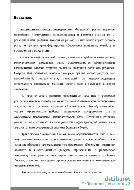 Отечественный фондовый рынок развивается крайне противоречиво. Его количественные изменения весьма редко приводят к качественными изменениями. Российский фондовый рынок по уровню своего развития значительно отстаёт, как от потребностей отечественной экономики в целом, так и отдельных предприятий в частности. Это обусловлено не только ограниченным набором в РФ финансовых инструментов, но и отсутствием необходимой законодательной базы. Потенциал рынка сдерживается из-за слабого развития инфраструктуры, а так же отсутствия в стране современной системы фондовых бирж это обстоятельство определяет актуальность данного исследования, а так же разработку основных вопросов в диссертации.