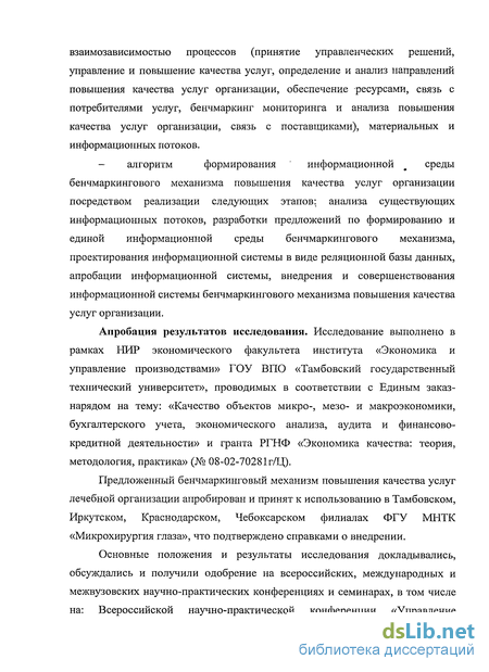 Предложенный бенчмаркинговый механизм повышения качества услуг лечебной организации апробирован и принят к использованию в Тамбовском, Иркутском, Краснодарском, Чебоксарском филиалах ФГУ МНТК «Микрохирургия глаза», что подтверждено справками о внедрении.