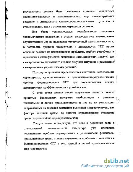 Предметом настоящего диссертационного исследования является комплексный анализ влияния основных внутренних и внешних факторов на механизм процесса формирования финансово-промышленных групп, моделирование в этом механизме характеристик эффективности и устойчивости, изучение особенностей создания и функционирования ФПГ в текстильной и легкой промышленности.