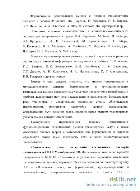 Совокупность перечисленных проблем эффективного функционирования региональных рынков транспортных услуг, а также отсутствие единых теории и методологии его формирования и развития обусловили выбор темы, постановку цели и задач диссертационного исследования.