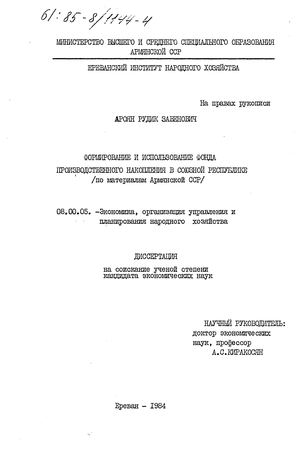 - Пофакторный анализ формирования фонда производственного накопления Армянской ССР