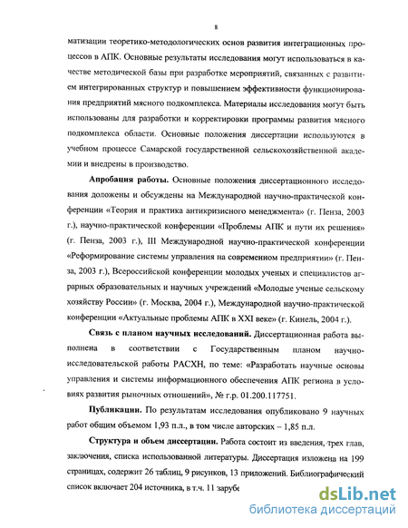 Теоретическая и практическая значимость исследования. Теоретическая значимость проведенного исследования заключается в анализе и систе матизации теоретико-методологических основ развития интеграционных процессов в АПК. Основные результаты исследования могут использоваться в качестве методической базы при разработке мероприятий, связанных с развитием интегрированных структур и повышением эффективности функционирования предприятий мясного подкомплекса. Материалы исследования могут быть использованы для разработки и корректировки программы развития мясного подкомплекса области. Основные положения диссертации используются в учебном процессе Самарской государственной сельскохозяйственной академии и внедрены в производство.