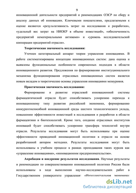 Апробация и внедрение результатов исследования. Научные результаты и рекомендации по совершенствованию инновационной политики России были использованы в ходе выполнения научно-исследовательских работ в Государственном университете управления: «Интеллектуальная экономика: развитие, образование и управление» (рег. номер 01201278146, 2013 г.); «Институциональные основы повышения эффективности национальной инновационной системы» (рег. номер 01201365946, 2013-2014 г.г.); «Качество и эффективность управления инновационным развитием экономики России» (рег. номер 01201278147; 2012-2013 г.г.); «Формирование институциональной инфраструктуры инновационного развития» (рег. номер 01201265726; 2012 г.); «Исследование особенностей социально-экономического развития стран БРИК (Бразилия, Россия, Индия, Китай)» (рег. номер 01200951708; 2010-2011 г.г.).