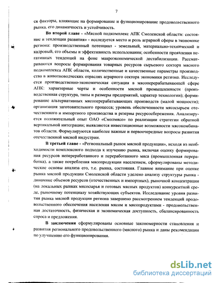 В третьей главе - «Региональный рынок мясной продукции», исходя из необходимости комплексного подхода к изучению рынка, включая оценку формирования ресурсов непереработанного и переработанного мяса (промышленная переработка), а также потребления мясопродукции населением, сформулированы методические основы анализа его, т.е. рынка, состояния. Главное внимание при оценке рынка мясной продукции Смоленской области уделено анализу структуры рынка -динамике объемов ресурсов (отечественных и импортных), рыночной концентрации (на локальных рынках мясосырья и готовых мясных продуктов) конкурентной среде, рыночному потенциалу хозяйствующих субъектов. Исследование уровня развития рынка мясной продукции региона завершено рассмотрением тенденций продовольственного обеспечения населения мясом и мясопродуктами - продовольственная достаточность, физическая и экономическая доступность, сбалансированность спроса и предложения.