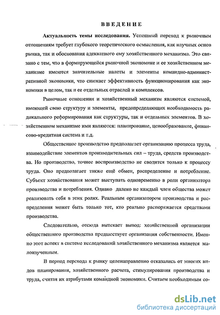 Актуальность темы исследования. Успешный переход к рыночным отношениям требует глубокого теоретического осмысления, как научных основ рынка, так и обоснования адекватного ему хозяйственного механизма. Это связано с тем, что в формирующейся рыночной экономике и ее хозяйственном механизме имеются значительные налеты и элементы командно-административной экономики, что снижает эффективность функционирования как экономики в целом, так и ее отдельных отраслей и комплексов.