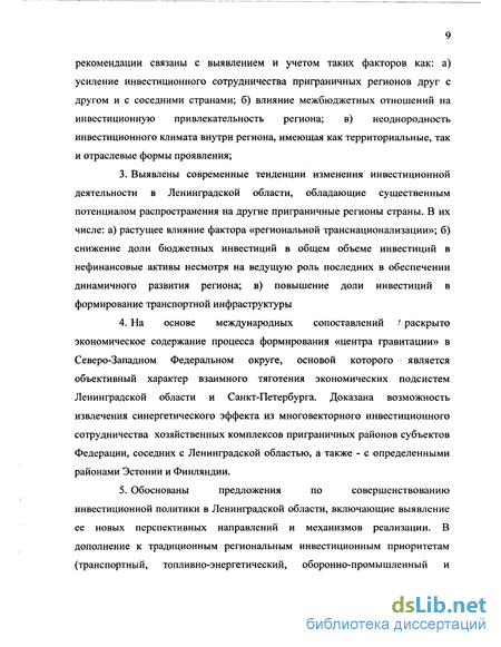 Ее разнообразие по направленности, приоритетам и масштабам инвестиций предопределяется наличием обширного числа иногда диаметрально противоположных геоэкономических, природно- географических, социально-экономических и многих других факторов. Тем не менее, типологическая группировка вариантов активизации инвестиционной деятельности в регионах России возможна и целесообразна. Соискатель полагает, что такой подход повышает обоснованность анализа сущности и особенностей региональной инвестиционной политики, ее механизмов, а также оценки эффективности. В этой связи в работе исследован опыт Ленинградской области и дана оценка возможности его совершенствования и использования в других приграничных субъектах Федерации. Анализ достоинств и недостатков в инвестиционной составляющей экономики Ленинградской области, находящейся в системе взаимозависимостей с Санкт-Петербургом, занимает центральное место в диссертации. Автором проведены сравнительные аналогии с канадской провинцией Квебек и индийским штатом Махараштра, в которых мегаполисы Монреаля и Бомбея, соответственно, являются центрами соответствующих экономических подсистем.