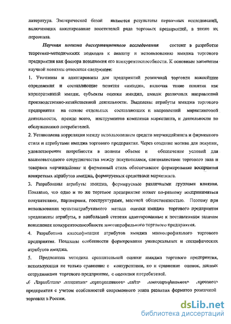 Научная новизна диссертационного исследования состоит в разработке теоретико-методических подходов к анализу и использованию имиджа торгового предприятия как фактора повышения его конкурентоспособности. К основным элементам научной новизны относится следующее: