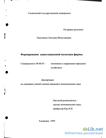 Во вторую группу включены вопросы оценки инвестиционных проектов, поскольку она является главным элементом формирования инвестиционной политики фирмы. Далее анализируется действующая практика организации инвестиционного процесса на некоторых фирмах, выявляются недостатки (первый параграф третьей главы). На основании обоснованной теории, выводов и анализа существующей практики разработаны рекомендации по совершенствованию инвестиционной политики на российских фирмах в современных условиях. Глава 1. Методологические вопросы управления инвестиционной деятельностью