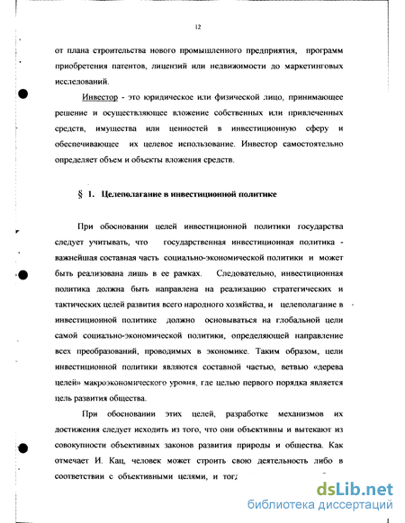 Переход к рынку потребовал коренных изменений в подходах к управлению инвестиционной деятельностью. Это обусловлено изменениями в целеполагании, государственной политике, финансировании и т.д. Поэтому исследования формирования инвестиционной политики следует начинать с вопросов обоснования целей инвестиционной политики. К сожалению, в экономической литературе проблеме целеполагания в инвестиционной политике на уровне общества не уделяется достаточно внимания: формулируются либо задачи, которые должны быть решены в краткосрочном или долгосрочном периоде (66, с. 10), либо принципы формирования инвестиционной политики (41, с. 26), либо сразу обосновываются приоритеты инвестиционной политики государства (52, с. 10).Тем не менее процессу исследования целей инвестиционной государственной политики должно быть уделено особое внимание.