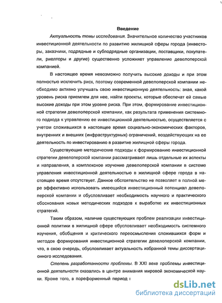 Однако многие вопросы, связанные с формированием инвестиционной стратегии развития девелоперской компании, остаются до настоящего времени малоисследованными. Недостаточная изученность и научная проработанность методов формирования и реализации инвестиционной стратегии девелоперской компании, с одной стороны, и научно-практическая значимость - с другой, определили выбор темы настоящего диссертационного исследования, цель, задачи и круг рассматриваемых в нем вопросов.