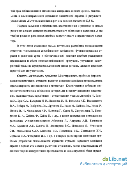Степень изученности проблемы. Многогранность проблемы формирования экономической стратегии развития сельского хозяйства предопределила фрагментарность его освещения в литературе. Классическими работами, синтез методологических обобщений которых лег в основу концепции диссертации, являются труды зарубежных и отечественных ученых: Ансоффа И., Бланка И., Брю С.А., Бухарина Н. К, Вавилова Н. И., Вальтуха К.К., Волконского В.А., Вебера М, Гэлбрейта Дж., Друккера П., Ками М., Кейнса Дж., Коуза Р., Ленина В, К, Макконелла К ,Р., Ньюмена П, Сакса Д,, Самуэльсона Л, Тимирязева К. А., Хайека Ф., Хейне П. и др., а также современные исследования российских ученых-экономистов: Абалкина Л., Алтухова А.И., Балкизова М.Х., Булатова А.Е., Бунича П., Золоторева B.C., Иншакова О., Кузнецова СВ., Магамедова О.Ю., Мазлоева В.З., Потемкина В.К., Саетгалиева З.И., Сергеева В.А., Федоренко И.В. и др., в которых рассмотрены важнейшие проблемы разработки экономической стратегии отраслей народного хозяйства страны в период становления рыночных отношений, дается представление об основах теории конкурентного преимущества и концептуальной базы опреде-