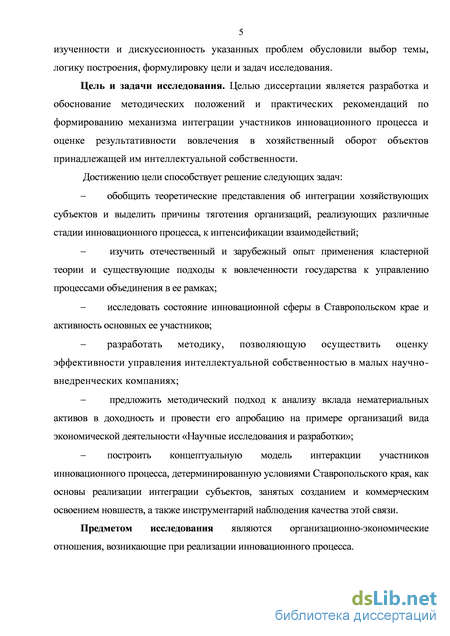 Цель и задачи исследования. Целью диссертации является разработка и обоснование методических положений и практических рекомендаций по формированию механизма интеграции участников инновационного процесса и оценке результативности вовлечения в хозяйственный оборот объектов принадлежащей им интеллектуальной собственности.