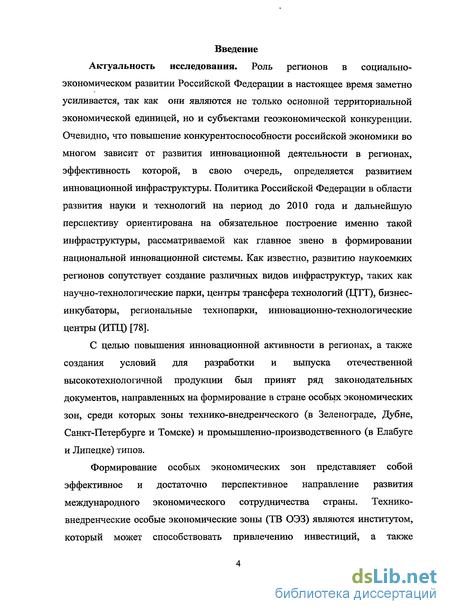 Актуальность исследования. Роль регионов в социально-экономическом развитии Российской Федерации в настоящее время заметно усиливается, так как они являются не только основной территориальной экономической единицей, но и субъектами геоэкономической конкуренции. Очевидно, что повышение конкурентоспособности российской экономики во многом зависит от развития инновационной деятельности в регионах, эффективность которой, в свою очередь, определяется развитием инновационной инфраструктуры. Политика Российской Федерации в области развития науки и технологий на период до 2010 года и дальнейшую перспективу ориентирована на обязательное построение именно такой инфраструктуры, рассматриваемой как главное звено в формировании национальной инновационной системы. Как известно, развитию наукоемких регионов сопутствует создание различных видов инфраструктур, таких как научно-технологические парки, центры трансфера технологий (ЦТТ), бизнес-инкубаторы, региональные технопарки, инновационно-технологические центры (ИТЦ) [78].