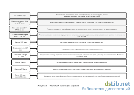 В настоящее время в экономической теории существует множество различных подходов к решению проблемы построения процесса управления затратами. Эволюция концепций управления затратами представлена на рисунке 1. Основоположником научного управления затратами общепризнанно считается Ф. Тейлор [214]. Существенным вкладом в научную теорию управления затратами Ф. Тейлора явились его работы в области стандартизации, оценки количества затрачиваемых ресурсов в условиях идеального производственного процесса. Позже Анри Файоль определил сущность учетной операции, определив основные понятия балансового метода учета, инвентаризации и издержек производства [210]. Таким образом затраты заняли собственное место в формирующейся научной теории менеджмента предприятий.