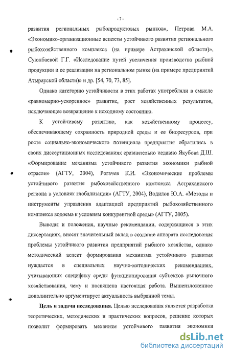 К устойчивому развитию, как хозяйственному процессу, обеспечивающему сохранность природной среды и ее биоресурсов, при росте социально-экономического потенциала предприятия обратились в своих диссертационных исследованиях сравнительно недавно Якубова Д.Ш. «Формирование механизма устойчивого развития экономики рыбной отрасли» (АГТУ, 2004), Рогачев К.И. «Экономические проблемы устойчивого развития рыбохозяйственного комплекса Астраханского региона в условиях глобализации» (АГТУ, 2004), Водилов Ю.А. «Методы и инструменты управления адаптацией предприятий рыбохозяйственного комплекса водоема к условиям конкурентной среды» (АГТУ, 2005).