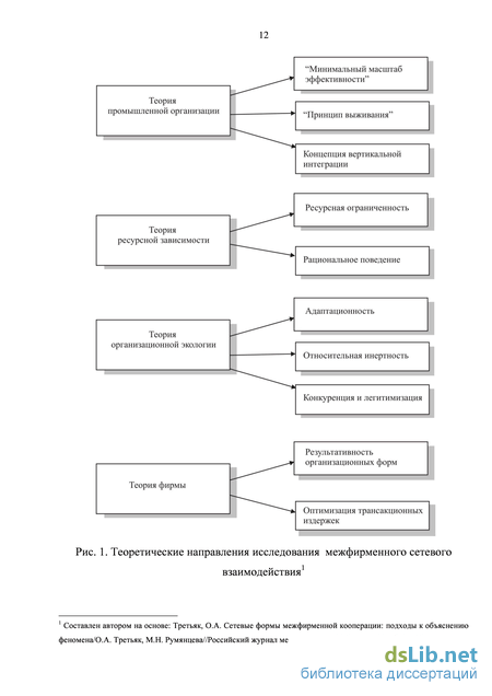 Описание формальных и неформальных отношений в организациях проводились ещё в 1920-х гг., например, в ходе Хоторнского эксперимента [167]. Однако активное изучение сетевых отношений началось с 1970-х гг. В процессе исследования анализировались различные аспекты отношений внутри и вне сетевой организации, а объектом исследования, как правило, выступали отношения между участниками сетевого взаимодействия. Среди экономических теорий, позволяющих проанализировать истоки и предпосылки сетевого межфирменного взаимодействия, следует назвать теорию промышленной организации. В рамках теории промышленной организации наиболее широкую известность приобрела концепция «отраслевой организации» рынка. По мнению Дж. Ричардсона в условиях нарастающей конкуренции во внешней среде, многие компании вынуждены были менять принципы организации [162].