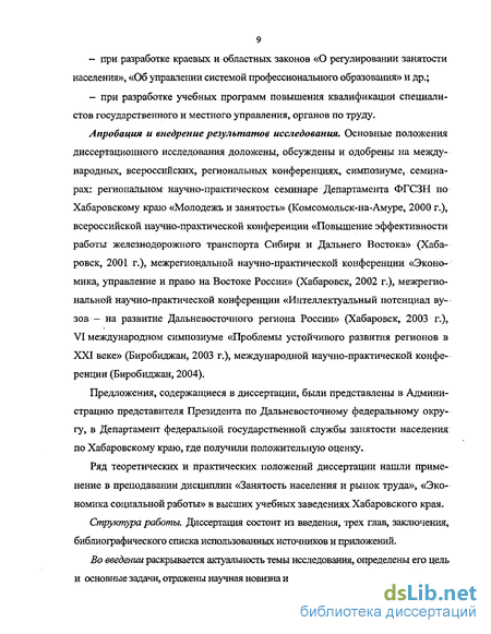 Апробация и внедрение результатов исследования. Основные положения диссертационного исследования доложены, обсуждены и одобрены на международных, всероссийских, региональных конференциях, симпозиуме, семинарах: региональном научно-практическом семинаре Департамента ФГСЗН по Хабаровскому краю «Молодежь и занятость» (Комсомольск-на-Амуре, 2000 г.), всероссийской научно-практической конференции «Повышение эффективности работы железнодорожного транспорта Сибири и Дальнего Востока» (Хабаровск, 2001 г.), межрегиональной научно-практической конференции «Экономика, управление и право на Востоке России» (Хабаровск, 2002 г.), межрегиональной научно-практической конференции «Интеллектуальный потенциал вузов - на развитие Дальневосточного региона России» (Хабаровск, 2003 г.), VI международном симпозиуме «Проблемы устойчивого развития регионов в XXI веке» (Биробиджан, 2003 г.), международной научно-практической конференции (Биробиджан, 2004).