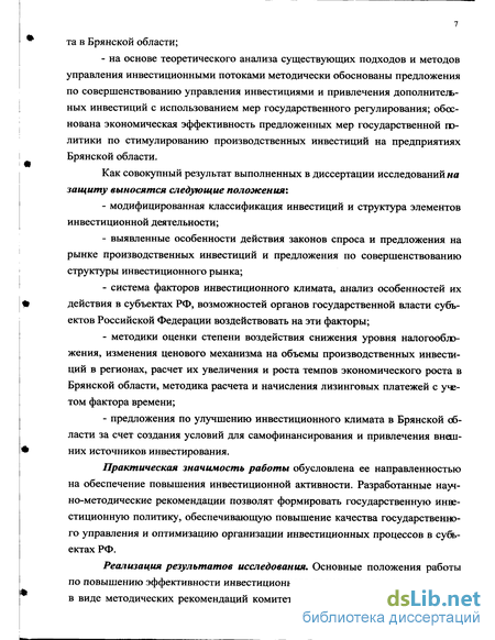 - на основе теоретического анализа существующих подходов и методов управления инвестиционными потоками методически обоснованы предложения по совершенствованию управления инвестициями и привлечения дополнительных инвестиций с использованием мер государственного регулирования; обоснована экономическая эффективность предложенных мер государственной политики по стимулированию производственных инвестиций на предприятиях Брянской области.