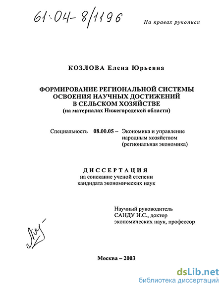 Предмет исследования - основные элементы организационно-экономъ .ескоіо механизма освоения научных достижений в региональном ЛПК, включая субт.е'кгы инновационной дсяіельности в аграрном секторе экономики Нижегородской облоги