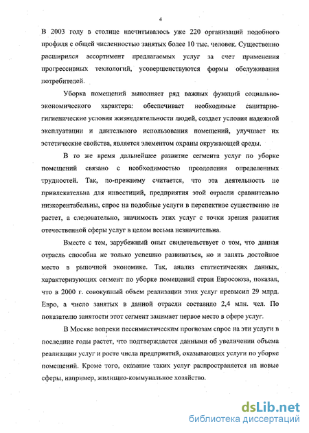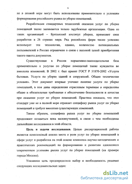 Цель и задачи исследования. Целью диссертационной работы является комплексный анализ места и роли услуг по уборке помещений в сфере услуг и разработка на этой основе комплекса научно-методических и практических рекомендаций по формированию и развитию адекватного современным условиям рынка услуг по уборке помещений (на примере города Москвы).