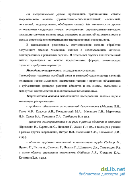 Методологическую основу исследования составили: Философская трактовка всеобщей связи и взаимообусловленности явлений; концепции нового мышления, взаимосвязи теории и практики, объективных и субъективных факторов развития общества и его систем, связанных с экспертной деятельностью и экономической безопасностью.