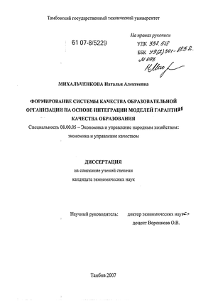 Апробация результатов исследования. Исследование выполнено в рамках НИР института «Экономика и управление производствами» Тамбовского государственного технического университета, проводимых в соответствии с Единым заказ-нарядом на тему: «Качество объектов микро-, мезо- и макроэкономики, бухгалтерского учета, экономического анализа, аудита и финансово-кредитной деятельности», а также в рамках научно-исследовательской разработки ГОУ ВПО «Коми республиканская академия государственной службы и управления при Главе Республики Коми» «Разработка и внедрение системы качества в образовательных организаций высшего профессионального образования», а также в рамках выполнения государственного контракта № 177-ОК по целевой республиканской программе "Развитие системы профессионального образования в Республике Коми" на 2004-2008 годы п.34 "Проведение научно-исследовательских работ в образовательных организациях профессионального образования Республики Коми".