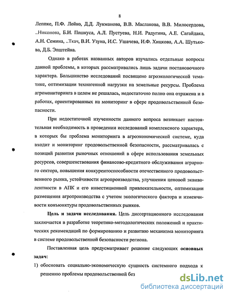 лишь задачи постановочного характера. Большинство исследований посвящено агроэкологической тематике, оптимизации техногенной нагрузки на земельные ресурсы. Проблема агромониторинга в целом не решалась, недостаточно полно она отражена и в работах, ориентированных на мониторинг в сфере продовольственной безопасности.