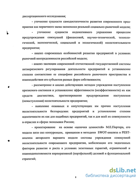 Цель и задачи исследования. Целью диссертационного исследования является разработка теоретических положений и методических подходов к формированию и развитию системы предупреждения наступления несостоятельности предприятия в условиях современного функционирования и развития на основе мобилизации его внутренних резервов, институционального обеспечения и щадящего (умеренного) государственного контроля, преобладающей функцией которого должен выступать предупредительный, а не ликвидационный мотив деятельности институтов банкротства.
