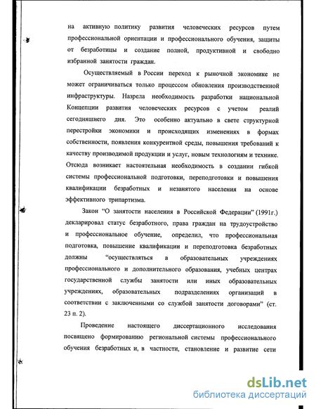 Закон "О занятости населения в Российской Федерации" (1991г.) декларировал статус безработного, права граждан на трудоустройство и профессиональное обучение, определил, что профессиональная подготовка, повышение квалификации и переподготовка безработных должны "осуществляться в образовательных учреждениях профессионального и дополнительного образования, учебных центрах государственной службы занятости или иных образовательных учреждениях, образовательных подразделениях организаций в соответствии с заключенными со службой занятости договорами" (ст. 23 п. 2).