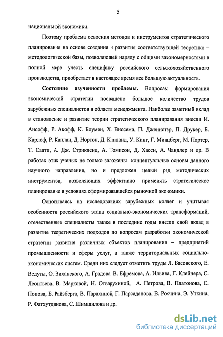 Основываясь на исследованиях зарубежных коллег и учитывая особенности российского этапа социально-экономических трансформаций, отечественные специалисты также в последние годы внесли свой вклад в развитие теоретических подходов по вопросам разработки экономической стратегии развития различных объектов планирования - предприятий промышленности и сферы услуг, а также территориальных социально-экономических систем. Среди них следует отметить труды Л. Басовского, Е. Ведуты, О. Виханского, А. Градова, В. Ефремова, А. Ильина, Г. Клейнера, С. Леонтьева, В. Марковой, Н. Отварухиной, А. Петрова, В. Платонова, С. Попова, Б. Райзберга, В. Парахиной, Г. Парсаданова, В. Рохчина, Э. Уткина, Р. Фатхутдинова, С. Шимшилова и др.