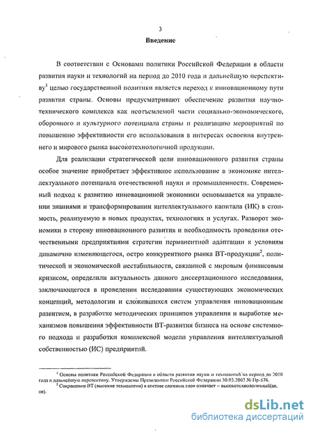 Для реализации стратегической цели инновационного развития страны особое значение приобретает эффективное использование в экономике интеллектуального потенциала отечественной науки и промышленности. Современный подход к развитию инновационной экономики основывается на управлении знаниями и трансформировании интеллектуального капитала (ИК) в стоимость, реализуемую в новых продуктах, технологиях и услугах. Разворот экономики в сторону инновационного развития и необходимость проведения отечественными предприятиями стратегии перманентной адаптации к условиям динамично изменяющегося, остро конкурентного рынка ВТ-продукции2, политической и экономической нестабильности, связанной с мировым финансовым кризисом, определили актуальность данного диссертационного исследования, заключающегося в проведении исследования существующих экономических концепций, методологии и сложившихся систем управления инновационным развитием, в разработке методических принципов управления и выработке механизмов повышения эффективности ВТ-развития бизнеса на основе системного подхода и разработки комплексной модели управления интеллектуальной собственностью (ИС) предприятий.