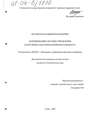 сформулирована концепция развития системы управления качеством на предприятиях санаторно-курортной сферы на основе международных стандартов системы качества (ИСО серии 9000) и предложена методика внедрения системы управления качеством на данных предприятиях.