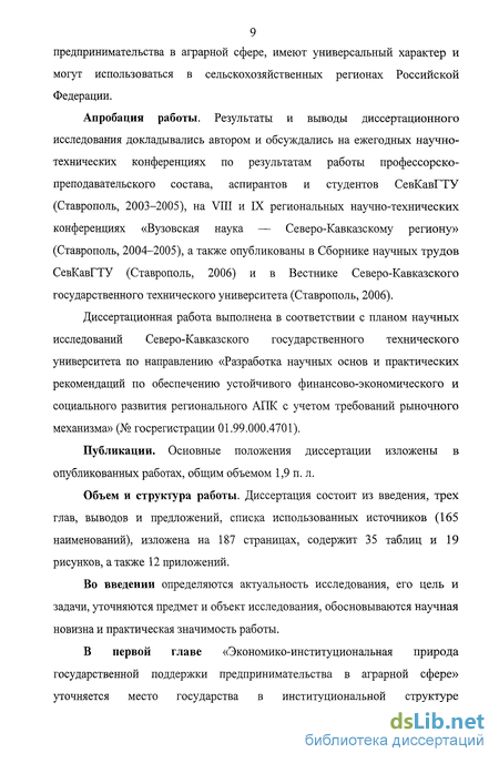 Теоретическая и практическая значимость работы состоит в обосновании необходимости трансформации государственной экономико-институциональной поддержки предпринимательства в сельском хозяйстве на координационно-замещающую основу, которая обеспечивает экономический рост предпринимательских структур различных форм собственности. Теоретические выводы и предложения, сформулированные в диссертации, вытекают из логики институционального анализа государственной поддержки предпринимательства в аграрной сфере РФ и Ставропольского края, обобщения статистических данных и социологических обследований экономических субъектов, хозяйствующих в растениеводстве, животноводстве и птицеводстве, а также изучения научной литературы.