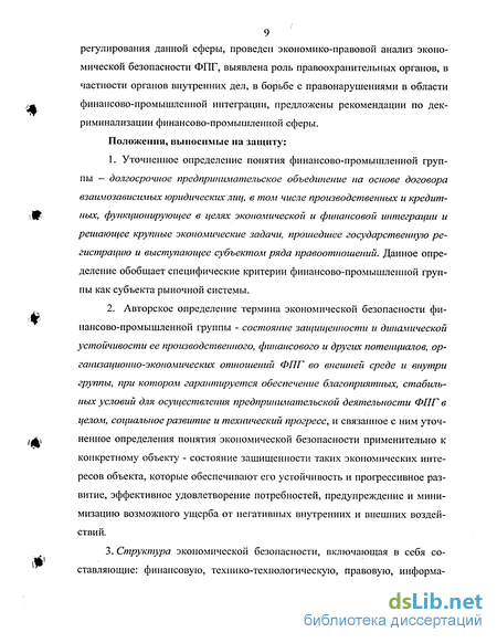Научная новизна исследования. Новизна исследования определяется спецификой современного состояния российской экономики, которая переживает серьезный кризис. В связи с появлением качественно новых сложных организационно-хозяйственных структур — финансово-промышленных групп автором поставлена новая научная проблема (проблема обеспечения экономической безопасности указанных предпринимательских объединений), сформулированы ключевые понятия, касающиеся сущности финансово-промышленной группы как элемента экономической системы, ее экономической безопасности, предложены новые подходы к методам государственного регулирования данной сферы, проведен экономико-правовой анализ экономической безопасности ФПГ, выявлена роль правоохранительных органов, в частности органов внутренних дел, в борьбе с правонарушениями в области финансово-промышленной интеграции, предложены рекомендации по декриминализации финансово-промышленной сферы. Положения, выносимые на защиту: