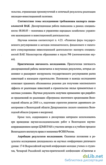 Практическая значимость исследования. Практическая значимость диссертационной работы заключается в полученных результатах, которые дополняют и расширяют инструменты государственного регулирования рынка инвестиций в жилищное строительство. Положения и выводы исследования позволяют принимать обоснованные решения для получения максимального эффекта от реализации инвестиций в строительство жилья применительно к местным условиям. Научные результаты получили применение при разработке предложений по реализации «Программы ипотечного кредитования Вологодской области до 2010 г.», подготовке стратегии развития деревянного домостроения в Вологодской области Департаментом лесного комплекса Вологодской области (справка о внедрении).