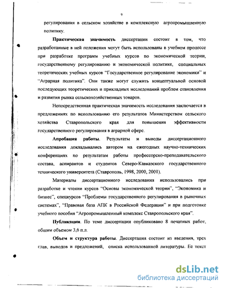 Материалы диссертационного исследования использовались при разработке и чтении курсов "Основы экономической теории", "Экономика и бизнес", спецкурсов "Проблемы государственного регулирования в рыночных системах", "Правовая база АПК в Российской Федерации" и при подготовке учебного пособия "Агропромышленный комплекс Ставропольского края".