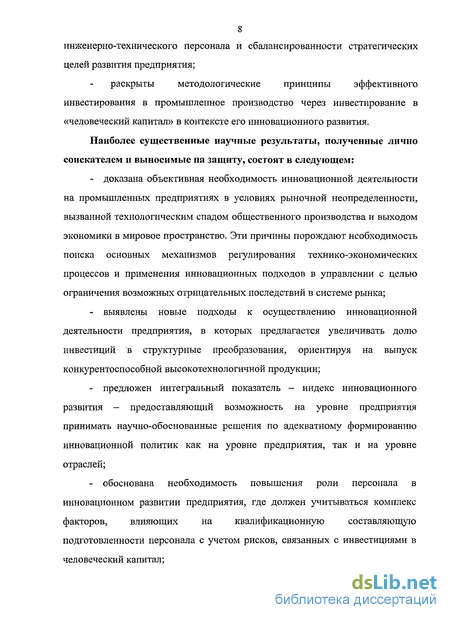 предложен интегральный показатель - индекс инновационного развития — предоставляющий возможность на уровне предприятия принимать научно-обоснованные решения по адекватному формированию инновационной политик как на уровне предприятия, так и на уровне отраслей;
