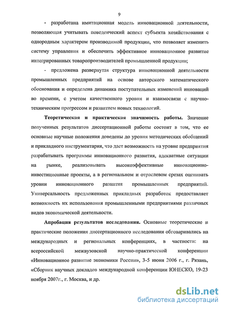 Апробация результатов исследования. Основные теоретические и практические положения диссертационного исследования обговаривались на международных и региональных конференциях, в частности: на всероссийской межвузовской научно-практической конференции «Инновационное развитие экономики России», 3-5 июня 2006 г., г. Рязань, «Сборник научных докладов международной конференции ЮНЕСКО, 19-23 ноября 2007г., г. Москва, и др.