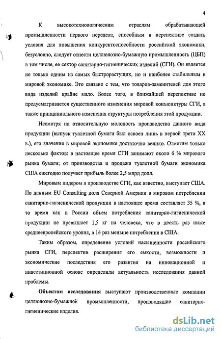 Степень научной разработанности проблем, составляющих основу диссертационного исследования, характеризуется незначительным числом научных и практических работ по данной проблематике. Интерес к подобным исследованиям в России возник недавно. Он был вызван, с одной стороны, началом бурного роста производства и потребления бумажной и гигиенической продукции в нашей стране и, с другой стороны, требованием взаимной увязки стратегии развития российских компаний и организацией финансирования производства санитарно-гигиенических изделий на инновационной основе.