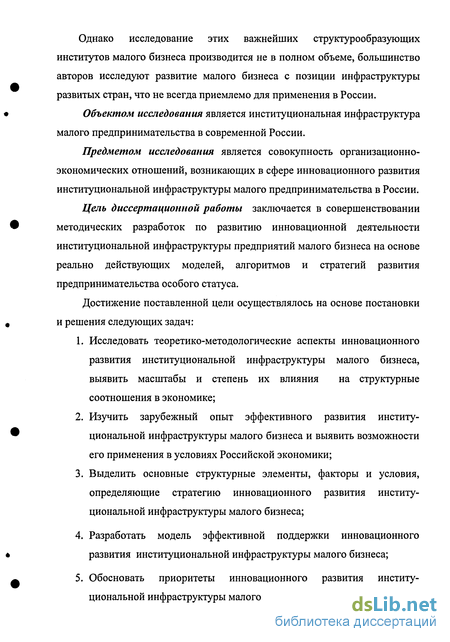1. Исследовать теоретико-методологические аспекты инновационного развития институциональной инфраструктуры малого бизнеса, выявить масштабы и степень их влияния на структурные соотношения в экономике;