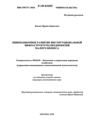 Цель диссертационной работы заключается в совершенствовании методических разработок по развитию инновационной деятельности институциональной инфраструктуры предприятий малого бизнеса на основе реально действующих моделей, алгоритмов и стратегий развития предпринимательства особого статуса.